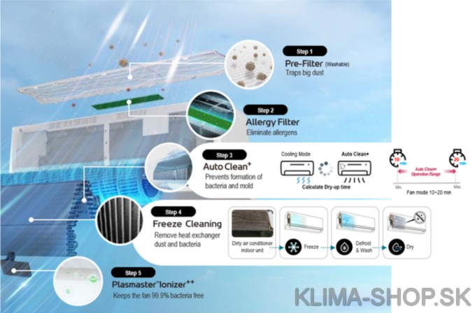 ❄️ Freeze Cleaning (Čistenie mrazom): Novinka roku 2025. Jednotka zamrazí prach a baktérie na výparníku a následným roztopením ich vyplaví von. Výsledkom je dokonale čistý vnútorný systém bez zápachu.